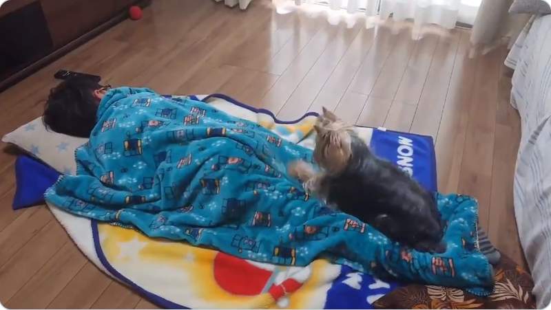 ▼網友們看到牠叫哥哥起床的影片紛紛笑說:「大笑ww原本想說還真會掀被子,沒想到目標是屁股。」