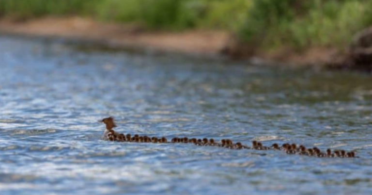 2020年05月12日小鴨幼稚園開課啦~最近美國攝影師Brent Cizek在明尼蘇達州伯米吉湖(Lake Bemidji)划船時,偶然看到了一隻秋沙鴨媽媽。牠正帶著一群小鴨游湖,那群毛茸茸的小鴨跟在媽媽身後,排成長長的一隊,場面很壯觀。