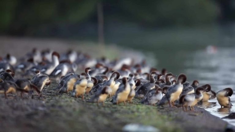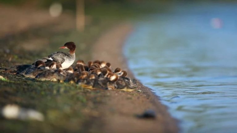 ▼照片中的這隻鴨媽媽更像一個「幼稚園園長」,牠照顧的這群小鴨中,有一些可能是牠的小孩,更多的是小鴨跟其他母鴨分散後,被牠撿到的。秋沙鴨會照顧好幾窩小鴨,但規模這麼大的非常罕見。