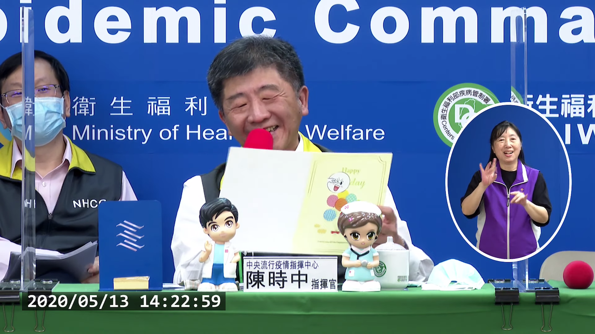 2020年05月14日中央指揮中心指揮官陳時中在5月13日的記者會上分享了一張卡片來信,卡片是由一對小姊妹所寫的,並隨信附上一對「醫護人員娃娃存錢筒」,存錢筒裡存有她們從家中長輩那邊所得到的零用錢,想一起送給阿中部長,讓他每天看著它們心情也會變好。