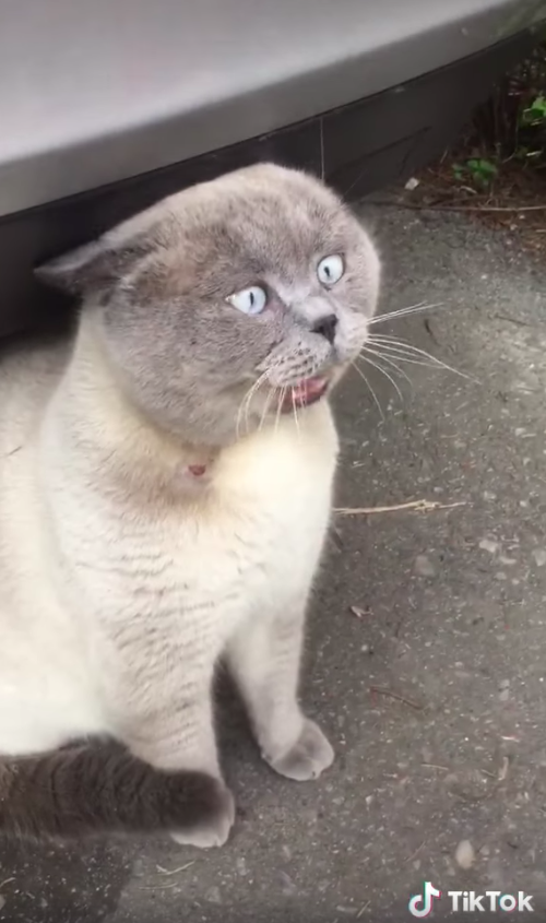 ▼這隻灰色的貓咪蹲在車邊,看到有人過來也沒有跑開。男子以為牠是很親人的那種貓咪,於是想摸摸牠。沒想到牠瞬間飛機耳,一臉警惕開始大叫:「哇嗚哇嗚哇嗚…」