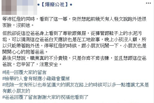 這篇貼文也釣出照片中的「本尊」爸爸回覆,表示自己是做鐵工的,因為工作收入受到影響,想要增加一點收入,所以下班兼差跑外送,所以身上還很髒,表示被拍到感到很不好意思,也謝謝大家湧入的祝褔。