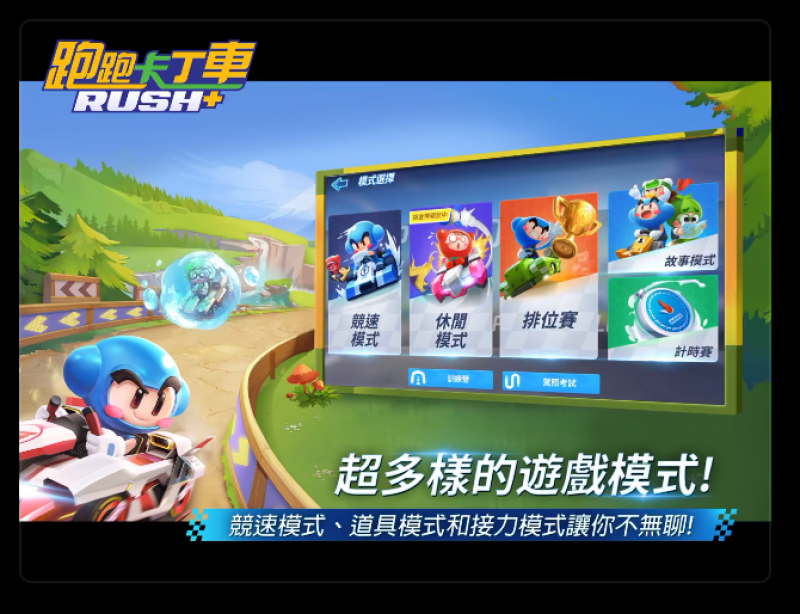 ▼跟《跑跑卡丁車》一樣,《跑跑卡丁車 Rush+》中有多種模式,包括競速模式、休閒模式、排位賽、故事模式,還有計時賽等等。