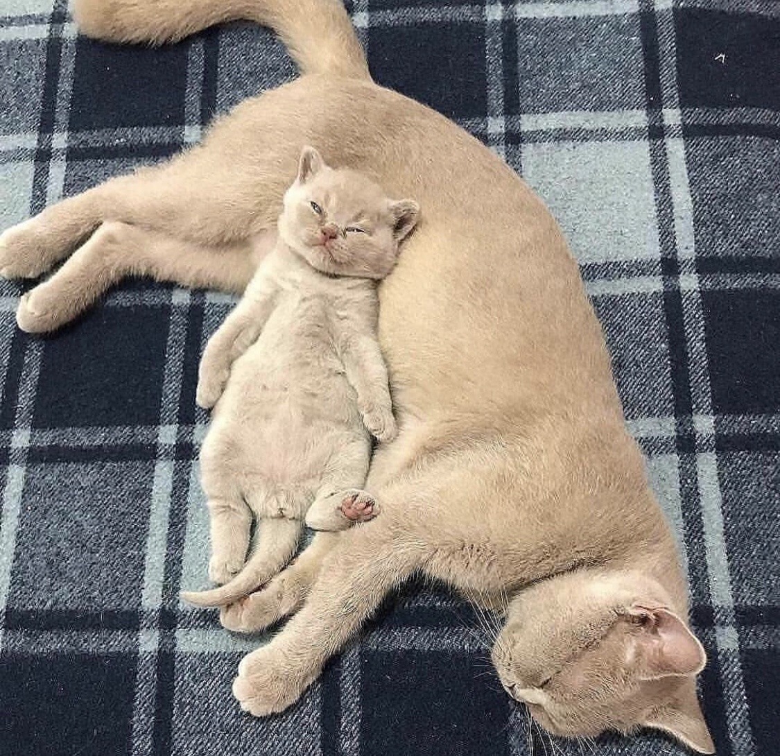 ▼貓媽媽抱著自己剛剛出生的寶寶。
