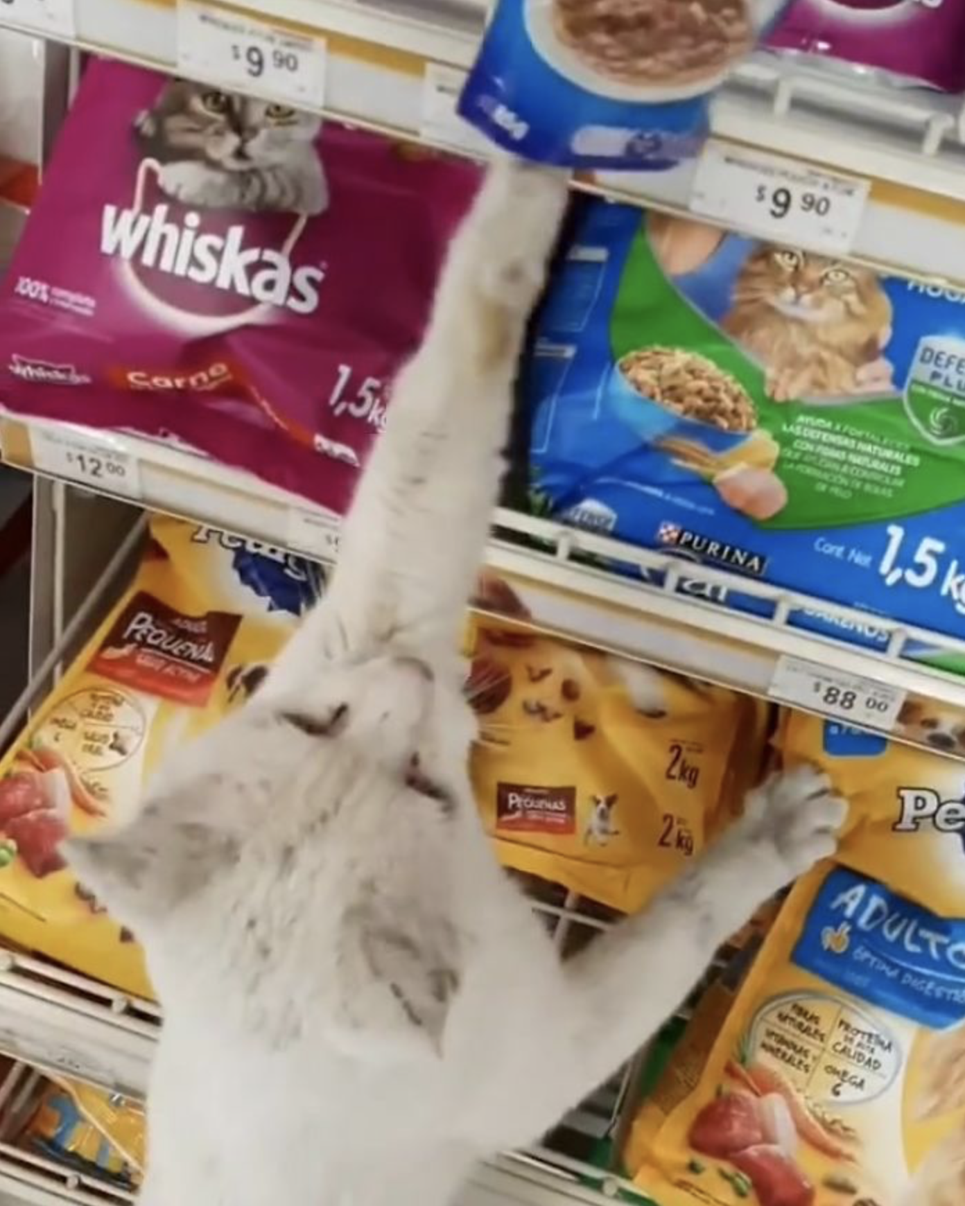 ▼今年33歲的Tania Lizbeth Santos Coy Tova是一位小學老師,她準備去商店買東西時,發現門口有一隻白貓。平時就很喜歡動物的Tania忍不住走過去摸了摸貓咪,沒想到貓咪跟著她進入商店,還引導她來到擺放貓糧的貨架前。