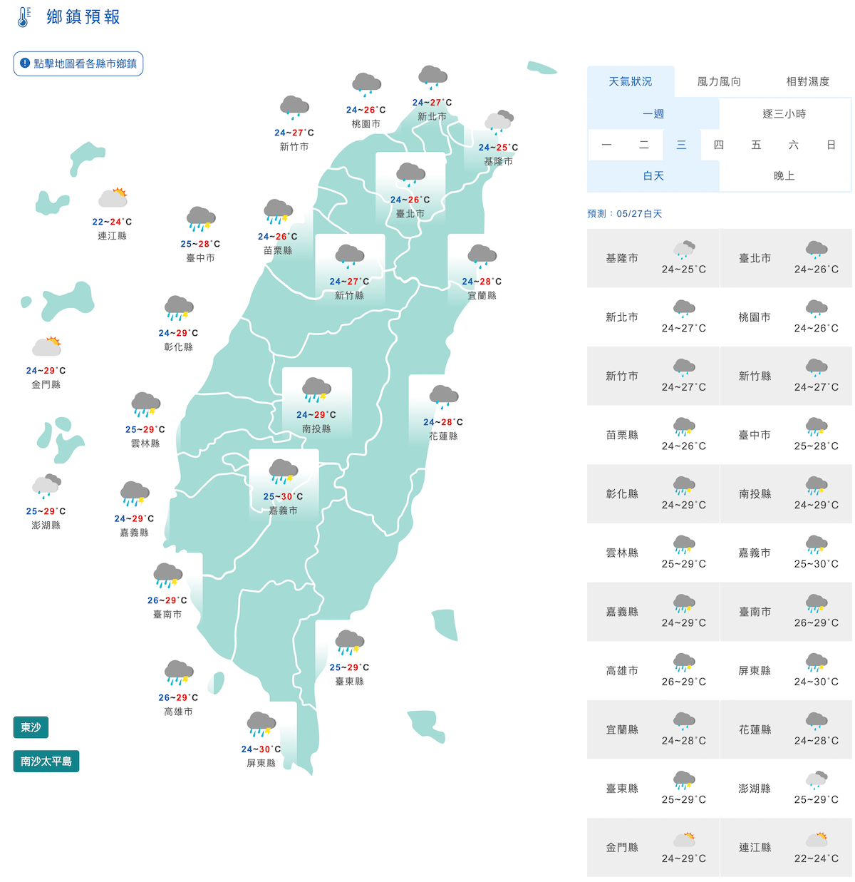 2020年05月25日星期一(5月25日)全台除東半地區、恆春半島有局部短暫陣雨外,其他為多雲到晴好天氣,氣溫上看30多度,大台北地區和其他山區會有午後短暫雷陣雨;但是星期二(26日)梅雨鋒面又再度靠近,中南部地區和離島澎湖、馬祖、金門會有局部短暫陣雨或雷雨,其他地區午後會有局部短暫雷陣雨,山區會有局部大雨機率發生。
