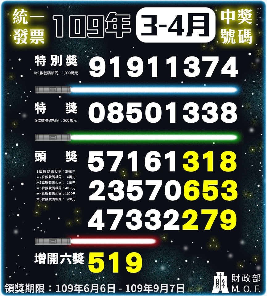 2020年05月26日又到了2個月1次的對發票時間啦,109年3、4月統一發票在5月25日公布對獎號碼,1000萬特別獎號碼為「91911374」,特獎200萬元中獎號碼是「08501338」,頭獎獎金20萬元3組號碼為「57161318」、「23570653」、「47332279」,增開6獎號碼為「519」。