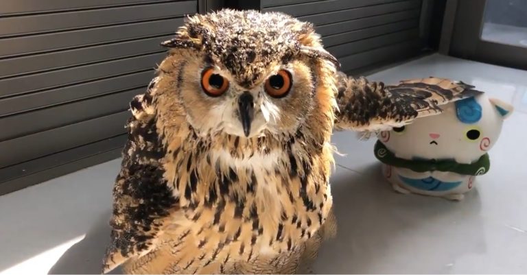 這隻我在罩的!貓頭鷹自認新朋友 瞪眼看主人:還不拿好料招待?