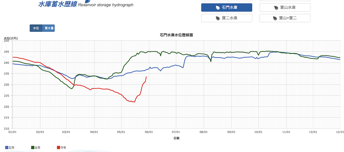 ▼北水局表示,今年春季石門水庫的降水率偏低,水庫的水位於5月16日的10點水位降至今年最低點221.96公尺,蓄水量僅只有5560萬頓,已在5月7日成立乾旱應變小組。也幸好5月的梅雨降雨量,光是5月統計至27日的單月降雨量已達到260公釐(約歷年同月降雨平均值的114%)。