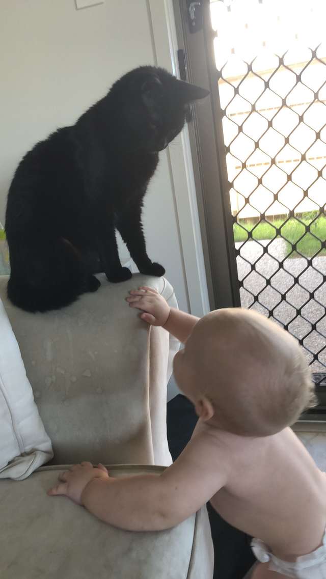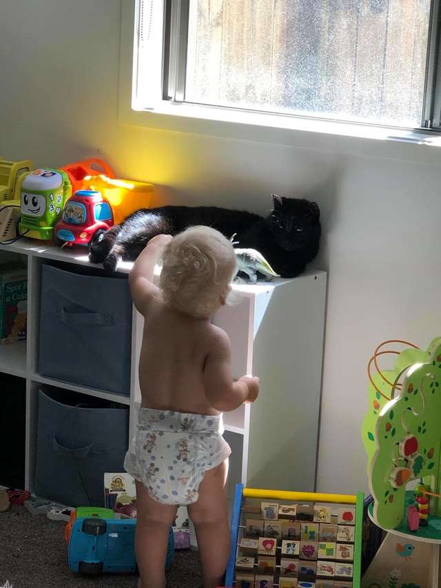 ▼Davern表示,她剛剛帶小孩回家時,Loki表現得很抗拒。牠看到小孩就逃得遠遠的,還會跳到高處觀察。後來牠逐漸習慣了小孩的存在,不再那麼敏感,但還是保持距離,不願意跟寶寶接近。
