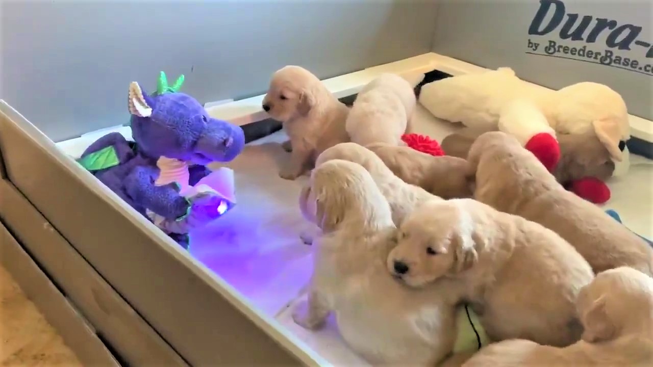 ▼坐在角落的紫色龍玩偶正捧著一本發光的書,嘴巴一開一合、搖頭晃腦地講故事。9隻小奶狗非常捧場,圍繞在它身邊,聽得很認真。