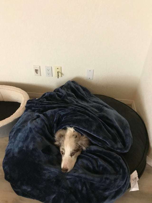 ▼除了Fusion,家裡還有另外2隻狗狗。牠們習慣跟馬麻一起在臥室裡睡,但Fusion會在自己的窩裡就寢。馬麻說:「Fusion看到同伴們跳到我的床上,就會走到自己的狗窩邊,站在那裡等著我、看著我,要我過去幫牠蓋被。」