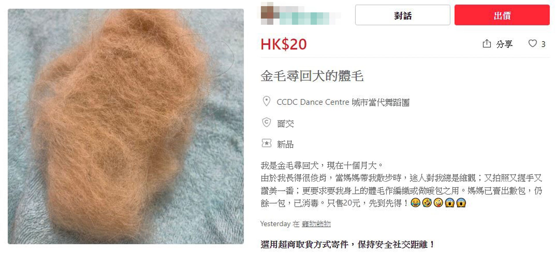 ▼女飼主還表示,她已經將狗毛消毒、包裝好,每一包的價格為20港元(約台幣77元)。「已賣出數包,仍餘一包,先到先得」。