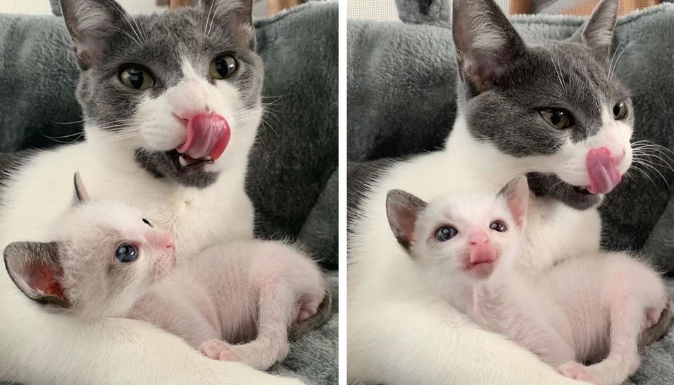 ▼當Guinness長大一些,Beth將牠介紹給家中的另外一隻大貓Mr. Tiny Pants。大貓會給Guinness舔毛: