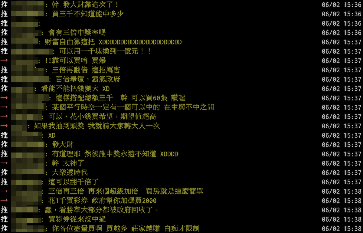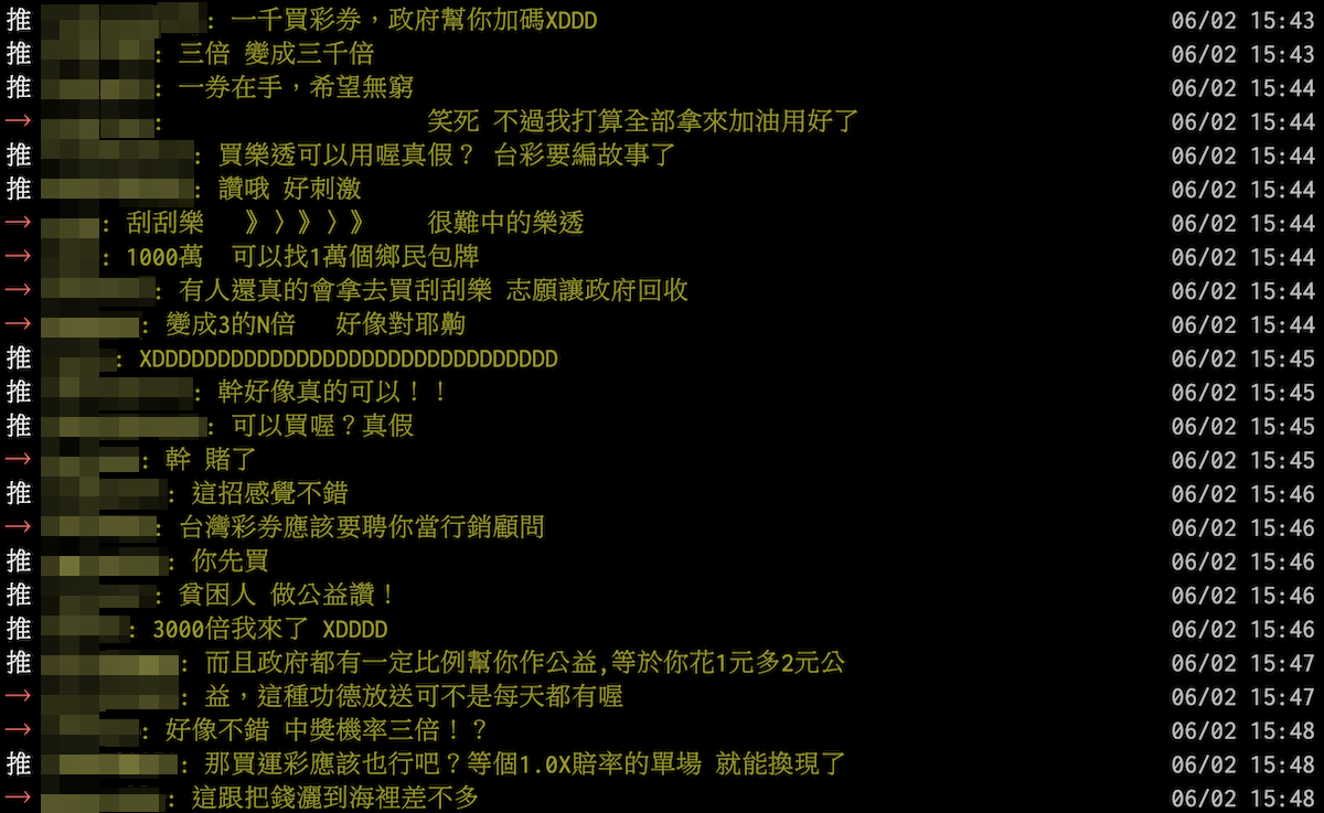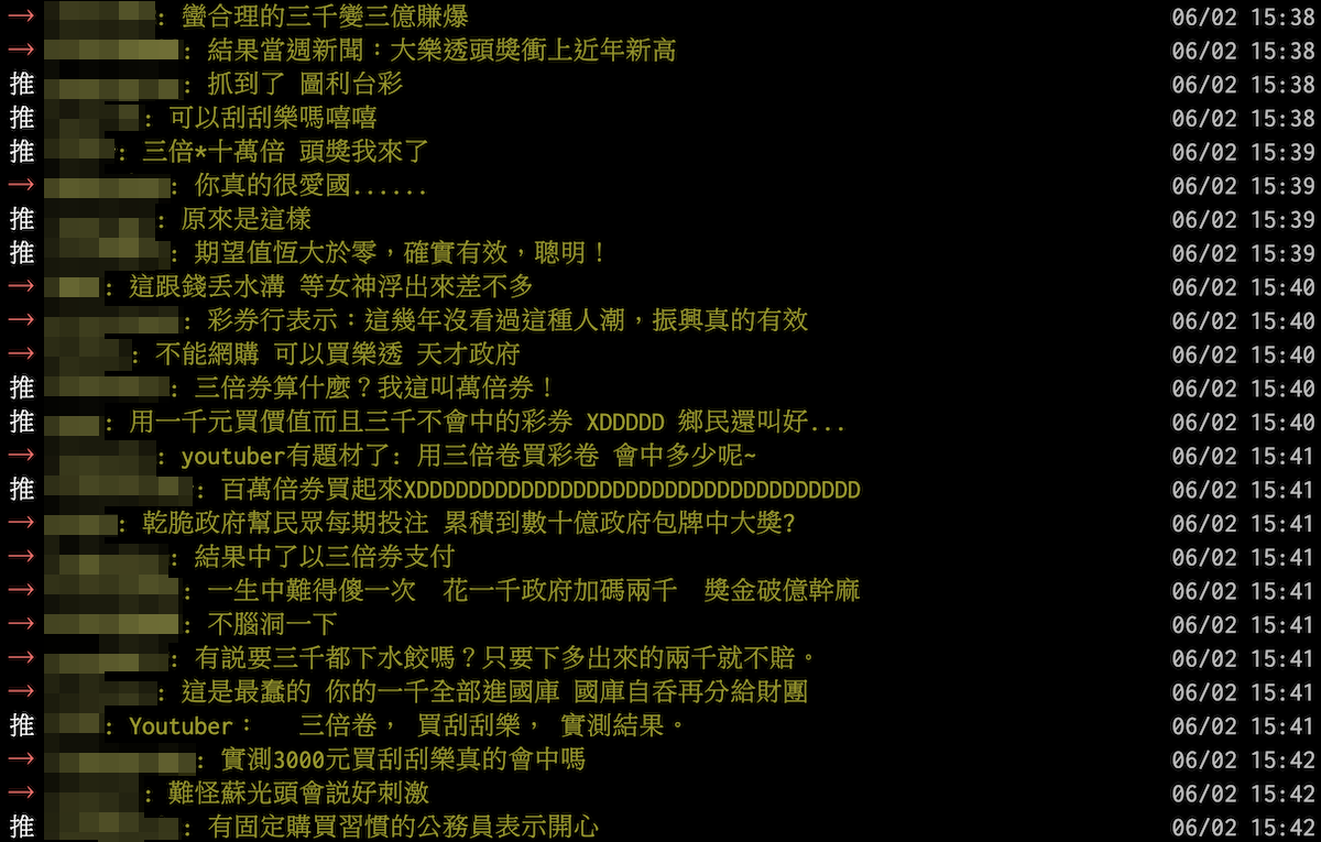 ▼許多網友看到這提議,紛紛回覆「三倍再翻倍,這招厲害」、「看能不能把錢變大XD」、「可以,花小錢買希望,期望值超高」、「有道理耶,然後誰中獎永遠不知道XDDD」、「結果當週新聞:大樂透頭獎衝上近年新高」,但是也有網友表示不認同,「這是最蠢的,你的一千全部進國庫,國庫自吞再分給財團」、「之前買一張兩千的一塊錢都沒中」、「這跟把錢灑到海裡差不多」、「買彩券從來沒中過」,大家都各有自己的看法。