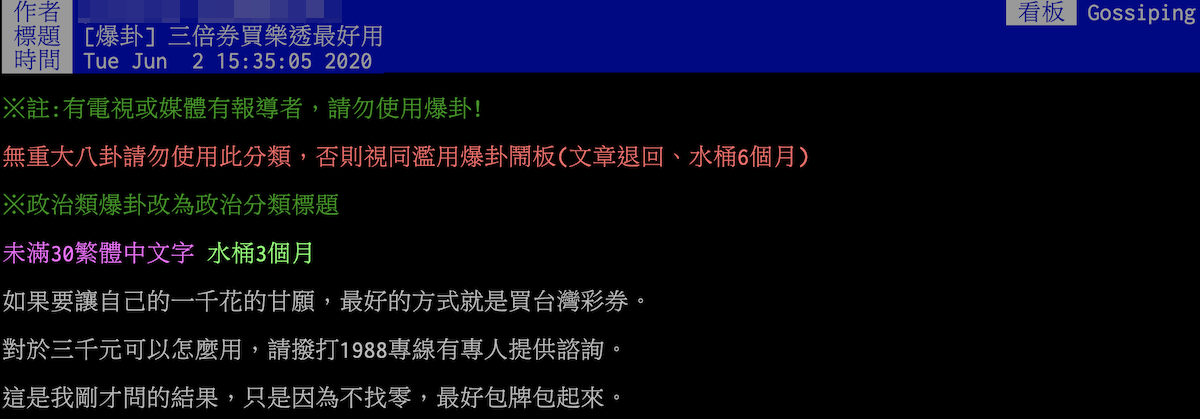▼為促進消費經濟,推出「三倍券」,因為三倍券的使用限制為實體店面、市場、餐廳、百貨等處,但是不可用於繳罰單、買菸、網購等,但是因為台彩屬公益使用所以可以購買。於是就有網友提出拿去買彩券的提議,表示「如果要讓自己的一千花得甘願,最好的方式就是買台灣彩券。」並表示因為三倍券不找零,所以「最好包牌包起來。」