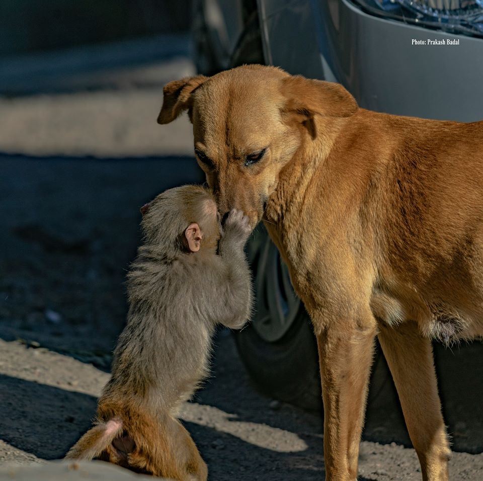2020年06月06日印度一位攝影師Prakash Badal在印度北部的喜馬偕爾邦(Himachal Pradesh)小村莊裡用相機捕捉到一系列溫馨的動物相片,照片中是一隻懷孕的汪星人和一隻小猴子,原來小猴子才剛出生10多天就舉目無親,幸好狗狗的母親本能讓牠把小猴子當成自己的孩子來養育。