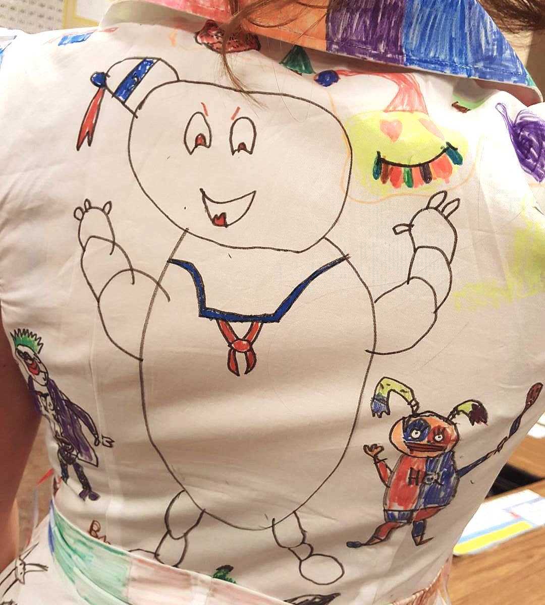 美國有一位國小女老師,讓她課堂上的孩子們自由揮灑創意,畫出他們自己心目中的畫面,但是表達創意的畫布媒介卻很出乎人的意料之外,不是傳統的畫布、畫紙,而是她居然讓學生自由拿畫筆畫圖在「衣服」上!