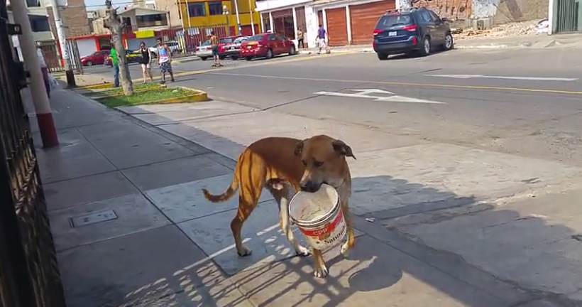 ▼當時天氣很熱,祕魯非常乾旱,當地河流、渠道等都乾涸了,在外討生活的動物們幾乎找不到自然的水源。這隻浪浪不知道從哪裡找來一個小水桶,竟然叼著它到處討水喝。