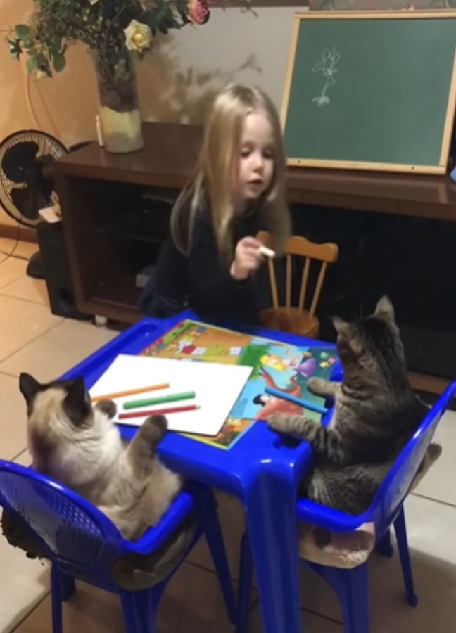 2020年06月13日這兩個學生太乖啦~國外一個家庭養了3只貓咪,其中虎斑貓Jurandir和喜馬拉雅貓Douglas感情最好,經常一起玩。最近小主人Clarinha想玩扮家家酒,她扮演老師,讓這兩隻貓咪扮演學生。Clarinha給貓咪學生上畫畫課,兩隻貓咪竟然聽得很認真!