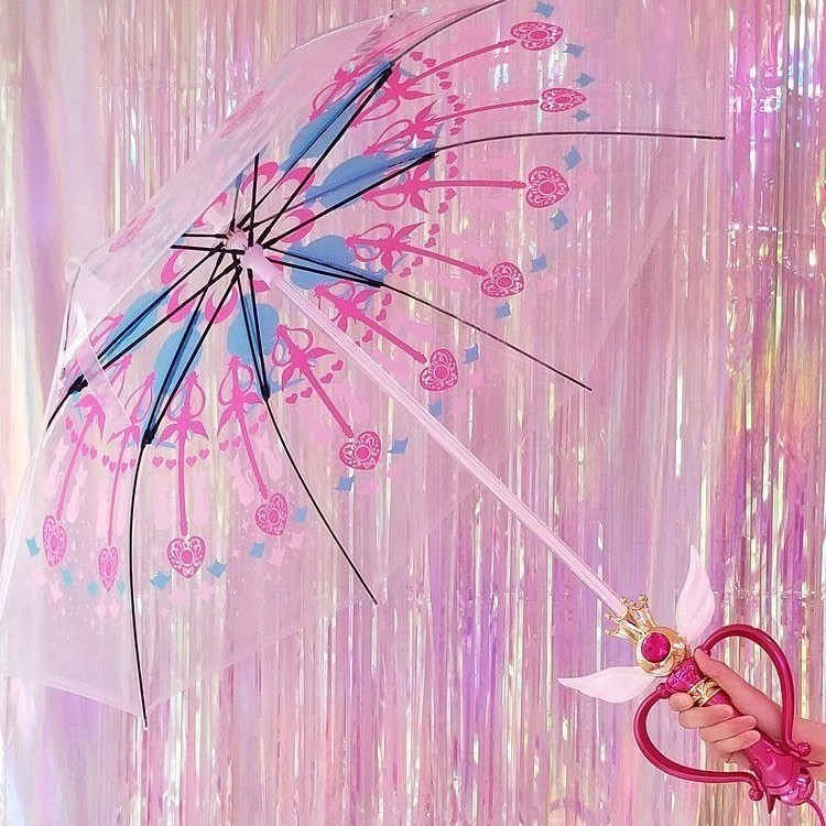 ▼第二款雨傘的傘身是全透明的,上面有粉紅色和天空藍色的圖案,組成《美少女戰士》特有的符號。手把則加入翅膀、大愛心等元素,在韓國的網路上討論度非常高。