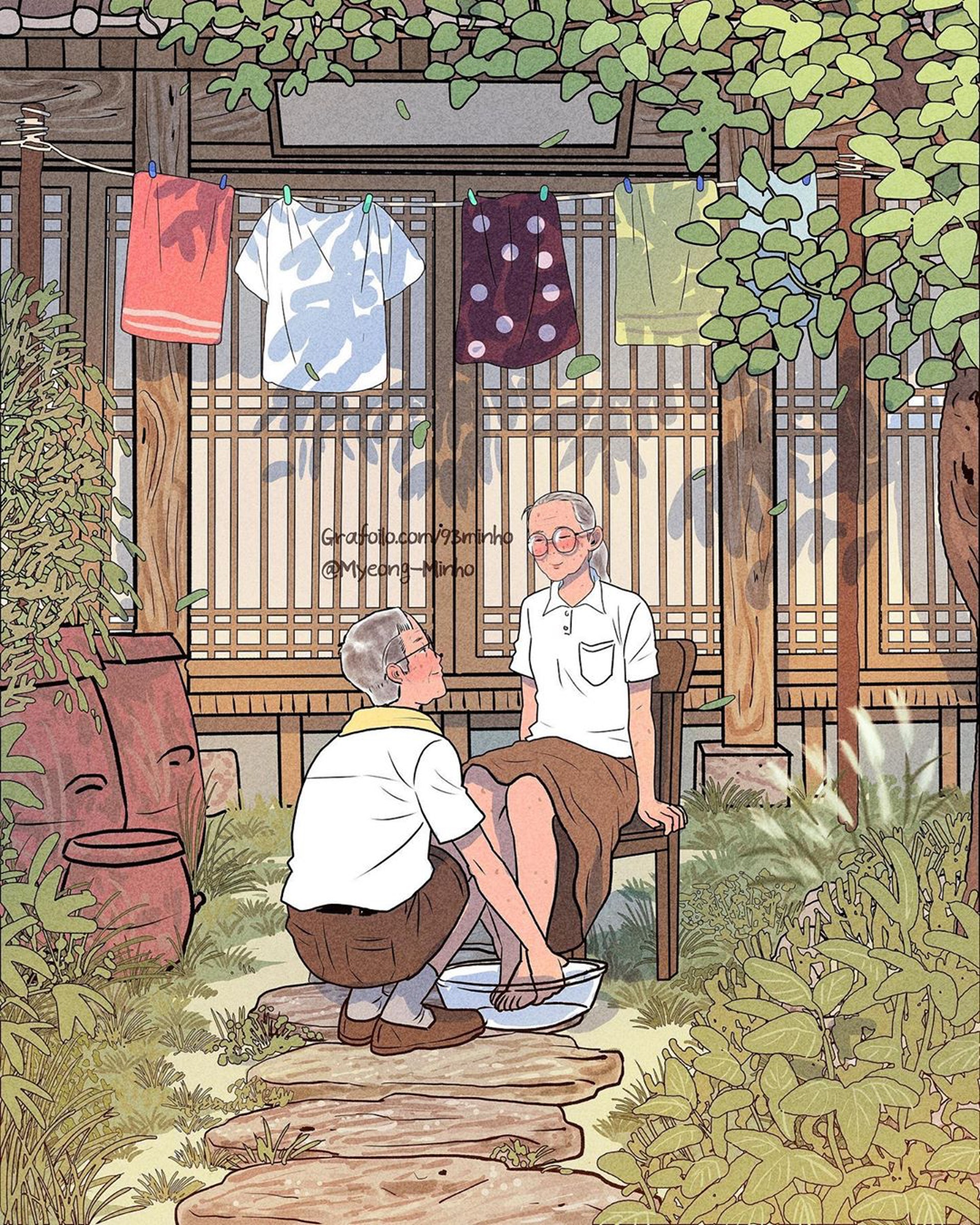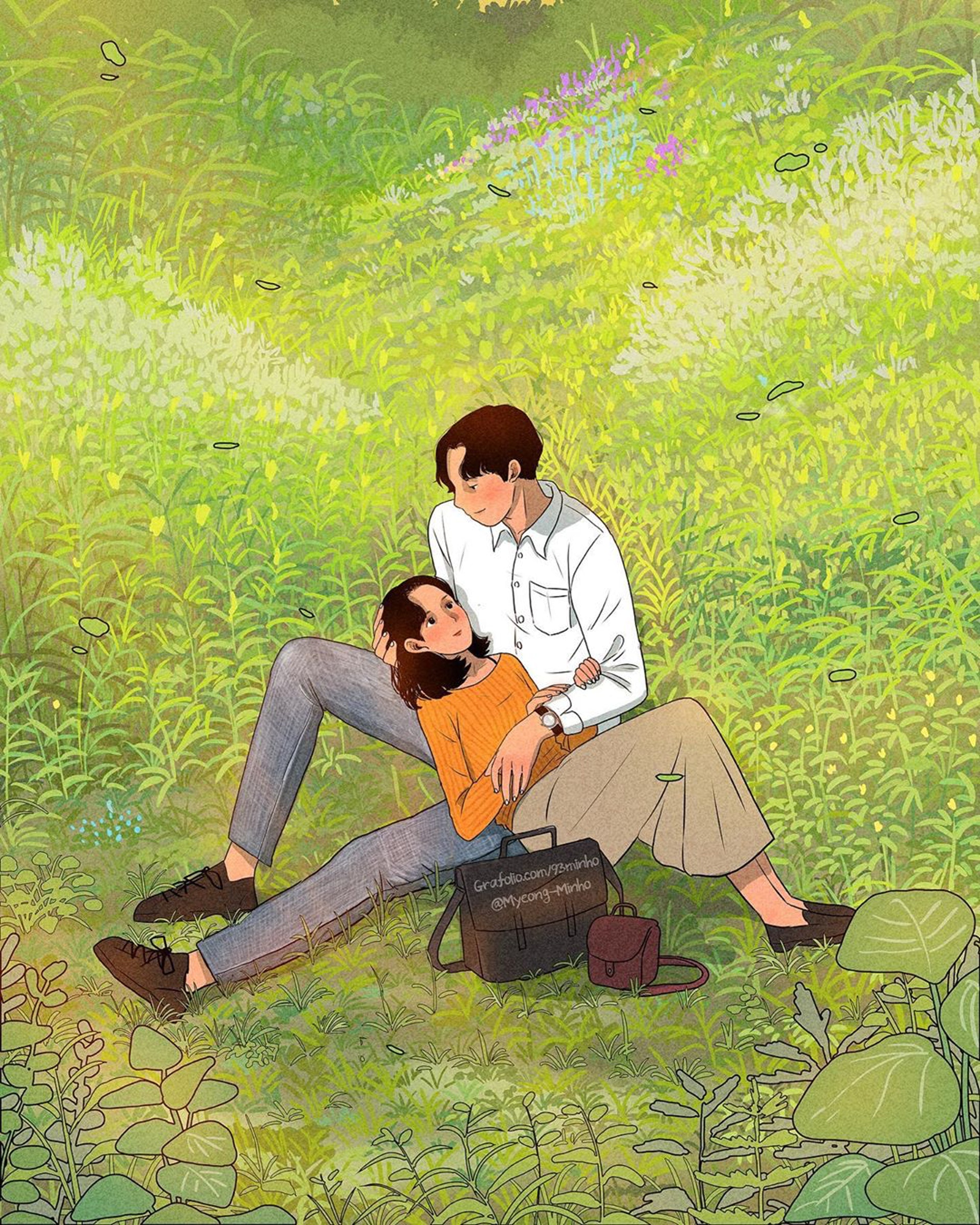 這位插畫家的作品非常療癒,情侶之間的甜蜜互動、夫妻之間的相濡以沫、老年情侶的白首之約,都讓人覺得非常浪漫。兩個人攜手走過漫長歲月,互相陪伴的愛情更讓人嚮往!
