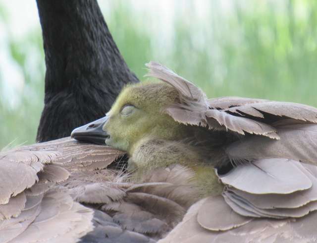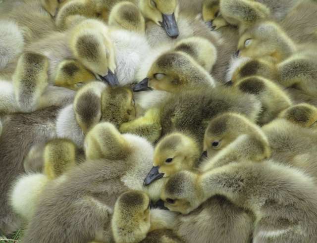▼小雁長得很快,已經不能躲在媽媽的羽翼之下了。牠們擠成一團睡覺時,雁媽媽就守在旁邊,盡職盡責保護牠們。