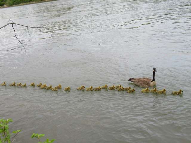 ▼Digout覺得很驚訝,這隻雁媽媽竟然有16個小孩!從那之後他每天都會去觀察這隻加拿大雁,沒想到跟在雁媽媽身後的小雁越來越多,從16隻變成25隻,後來成了30隻,最後竟然達到了47隻。