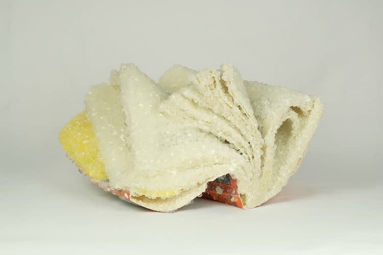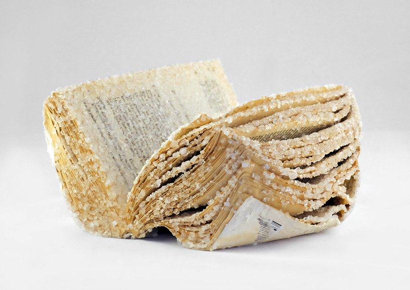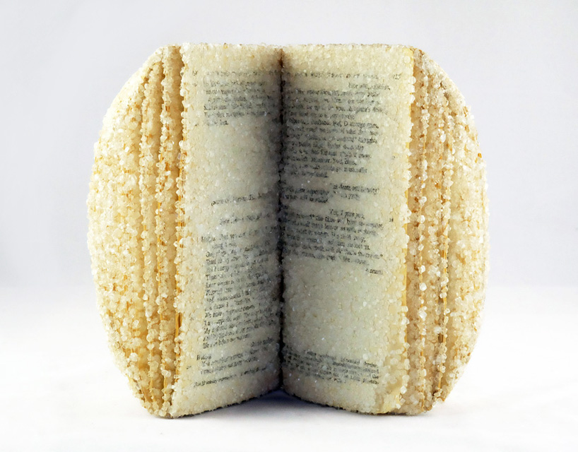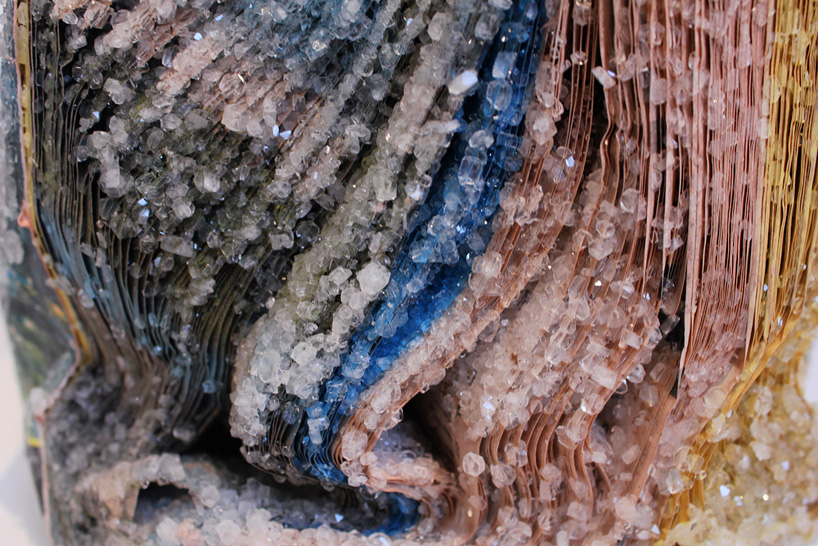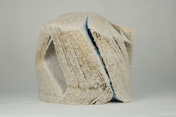 ▼Alexis將普通的舊書變成了璀璨的「水晶書」。她首先用水將書弄濕,讓書頁捲翹,然後將硼砂混合物溶於書本之上,最後放進冷凍庫,讓它凝固成雕塑的質地。