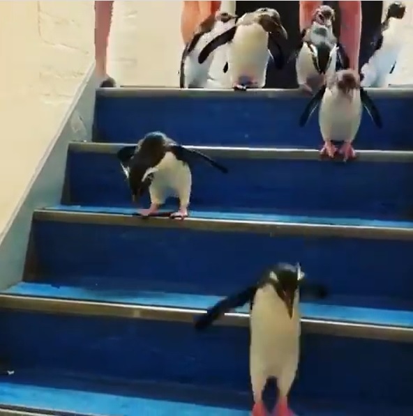 ▼後方的企鵝被鼓舞,跟著前面的企鵝往下跳。牠們低頭認真看台階,然後小心翼翼下樓的模樣很可愛。