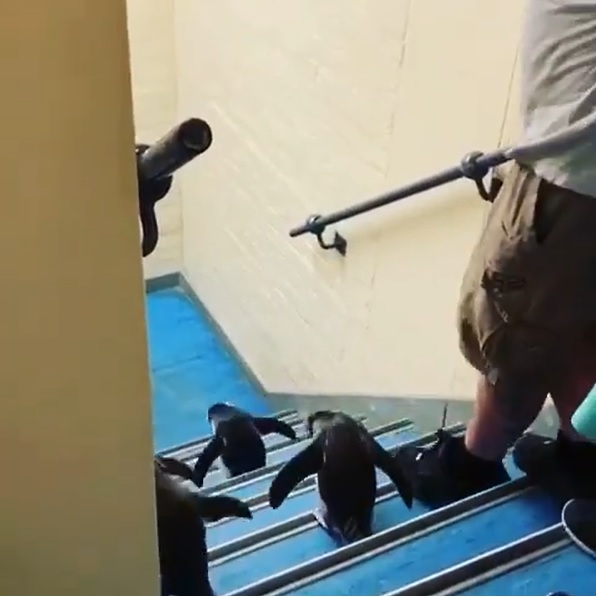2020年06月21日企鵝走起路來搖搖晃晃的,非常可愛,牠們下樓梯的樣子更有趣!最近南非開普敦的兩洋水族館(Two Oceans Aquarium)出現了萌萌的一幕。工作人員帶領一群企鵝轉移到另一區域時要經過一段樓梯,企鵝們蹦蹦跳跳下樓梯的樣子太療癒了。