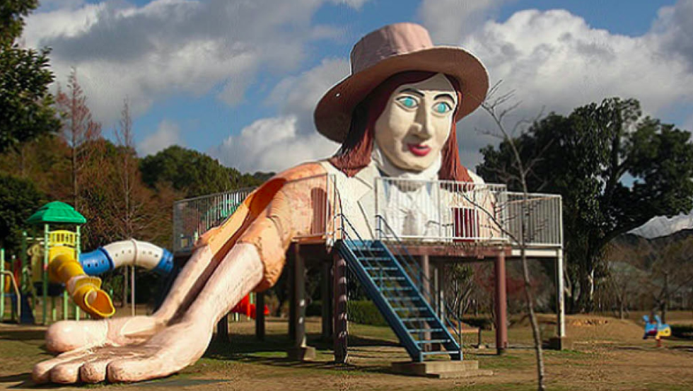 ▼三重縣市民之森公園:這個高6公尺、寬12公尺的溜滑梯外觀很誇張,那個長有紅色長髮、藍色眼睛的女人伸出右手臂,造型怪怪的。據說這曾經是移民船上的休閒設施。