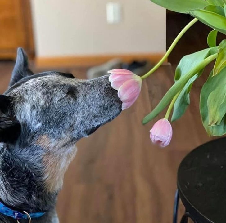 ▼狗狗也懂得欣賞花香。