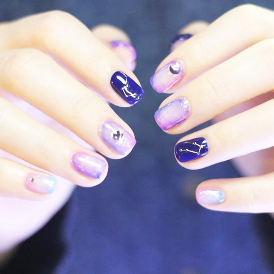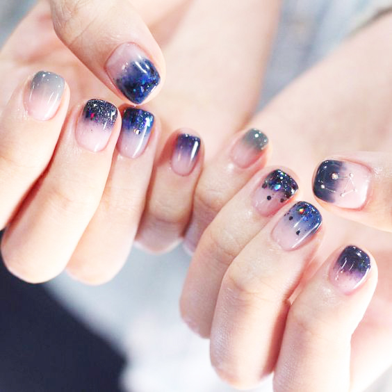 ▼漸變的星空美甲非常漂亮,由透明延伸到深藍色與深紫色,層次感滿滿,搭配閃片和設計過的星座圖案閃石,更加美麗。