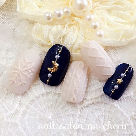▼步入冬季的話當然不能少了雪花元素。純色的指甲上點綴著雪花和星星圖案,凹凸的圖案讓指甲不再平凡。金色的星星、月亮還有珍珠,是不是優雅高貴?
