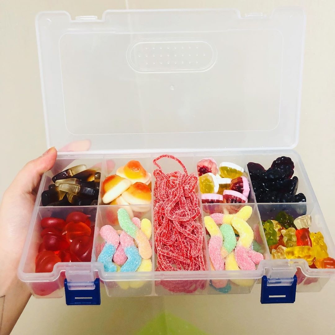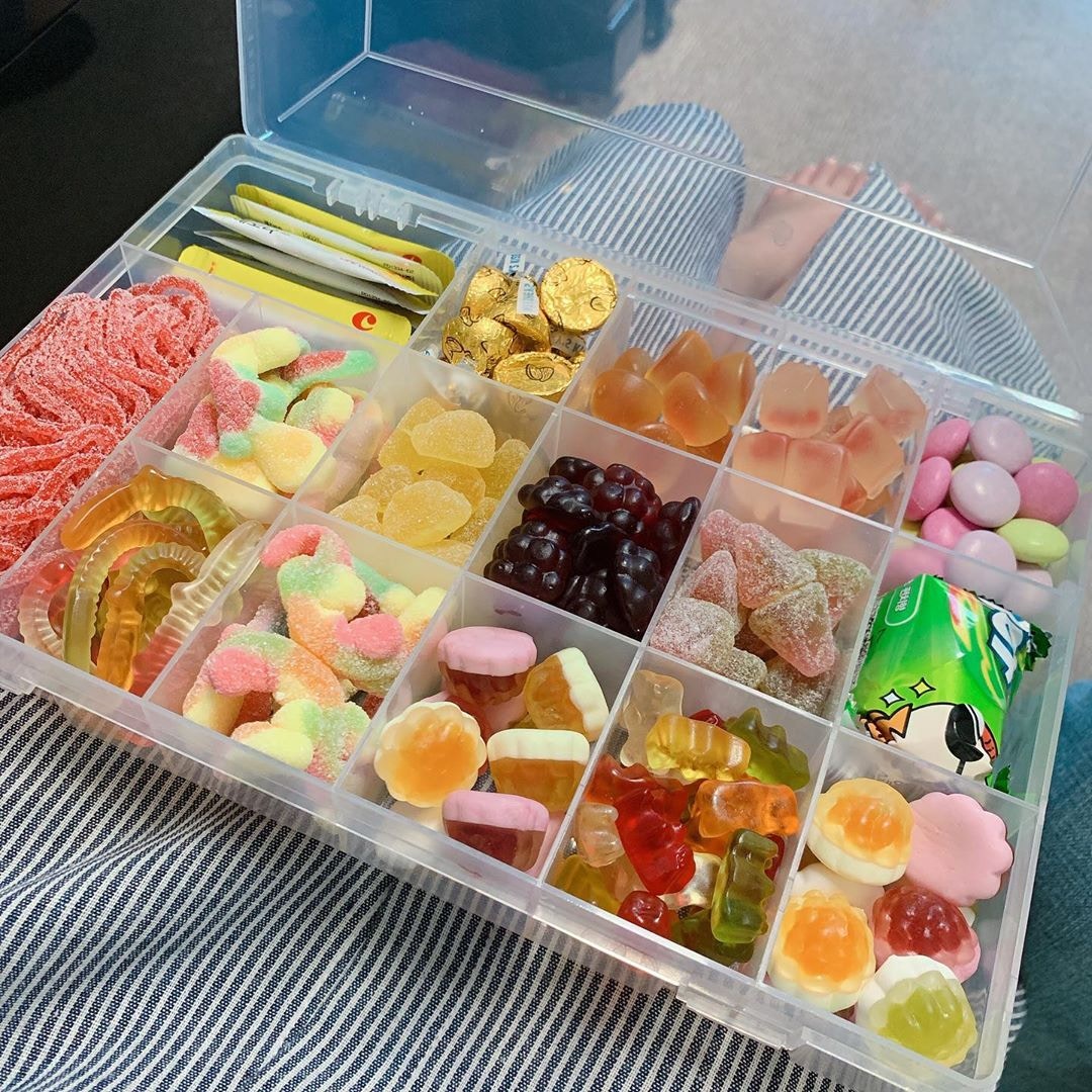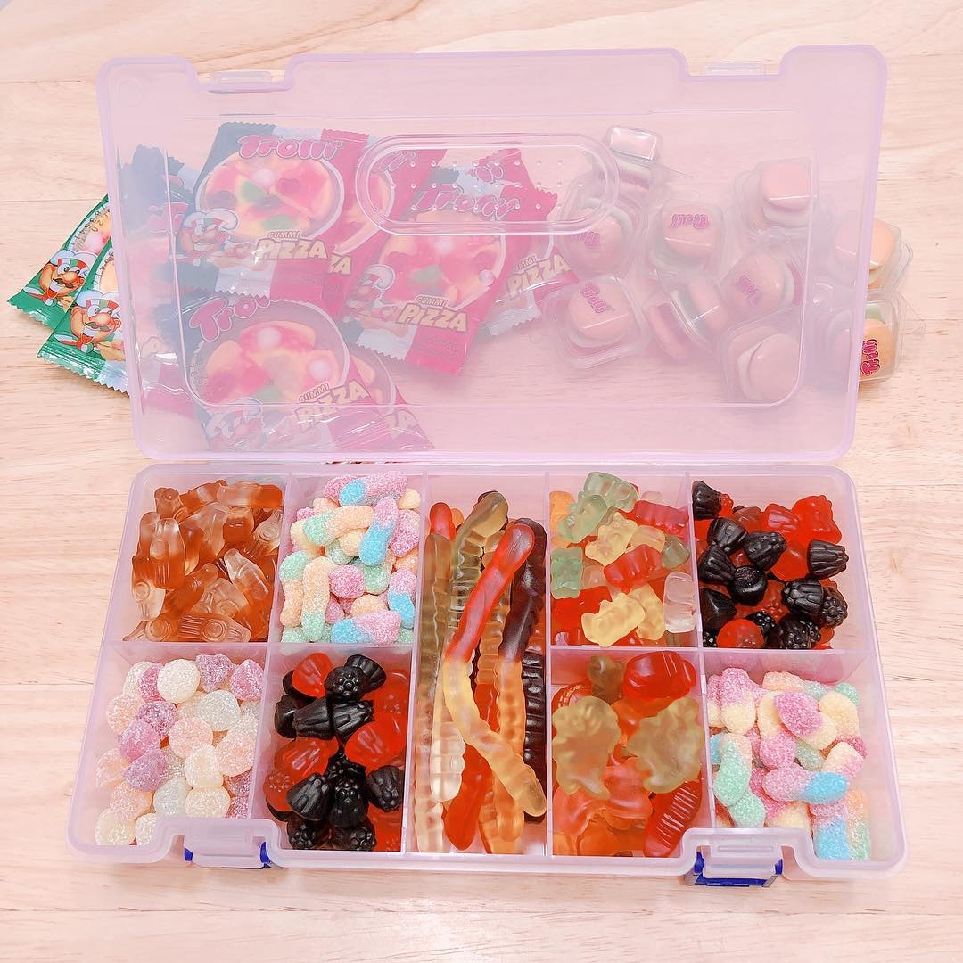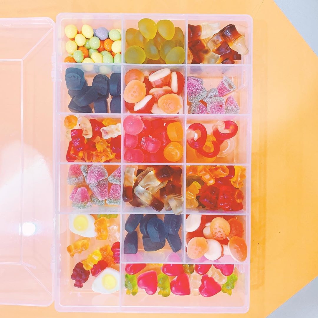▼這些「飯盒」分為一個個小格,裡面裝著不同的糖果和零食。軟糖被分類放好,想吃哪一種就拿哪一種,一目了然。