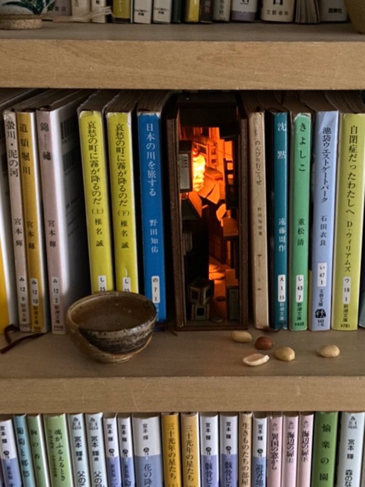 ▼每一個書架就像藏了一個自成的世界,書架裡面甚至還自附一個電燈開關,開啟小燈的書架整個氛圍又像是變了一個似的,昏黃的燈光搭上狹窄的巷弄景緻,份外溫馨!