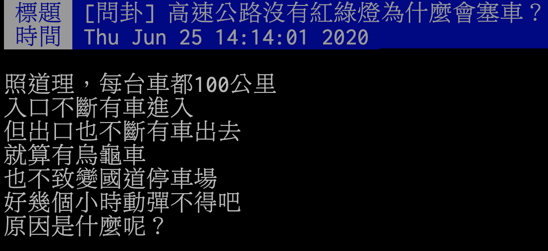 ▼原PO在八卦版上發文提問,納悶為什麼高速公路明明沒有交通燈路口,卻依然會造成塞車。有鄉民留言回覆,「下交流道在塞」、「因為內線一直龜到目的地才慢慢切出來」、「沒有共識」;也有鄉民有同樣的疑惑,「這個問題我也想過耶,不是一台接著一台開就好嗎?」就有一位鄉民貼出一則影片解惑塞車其中的原理。