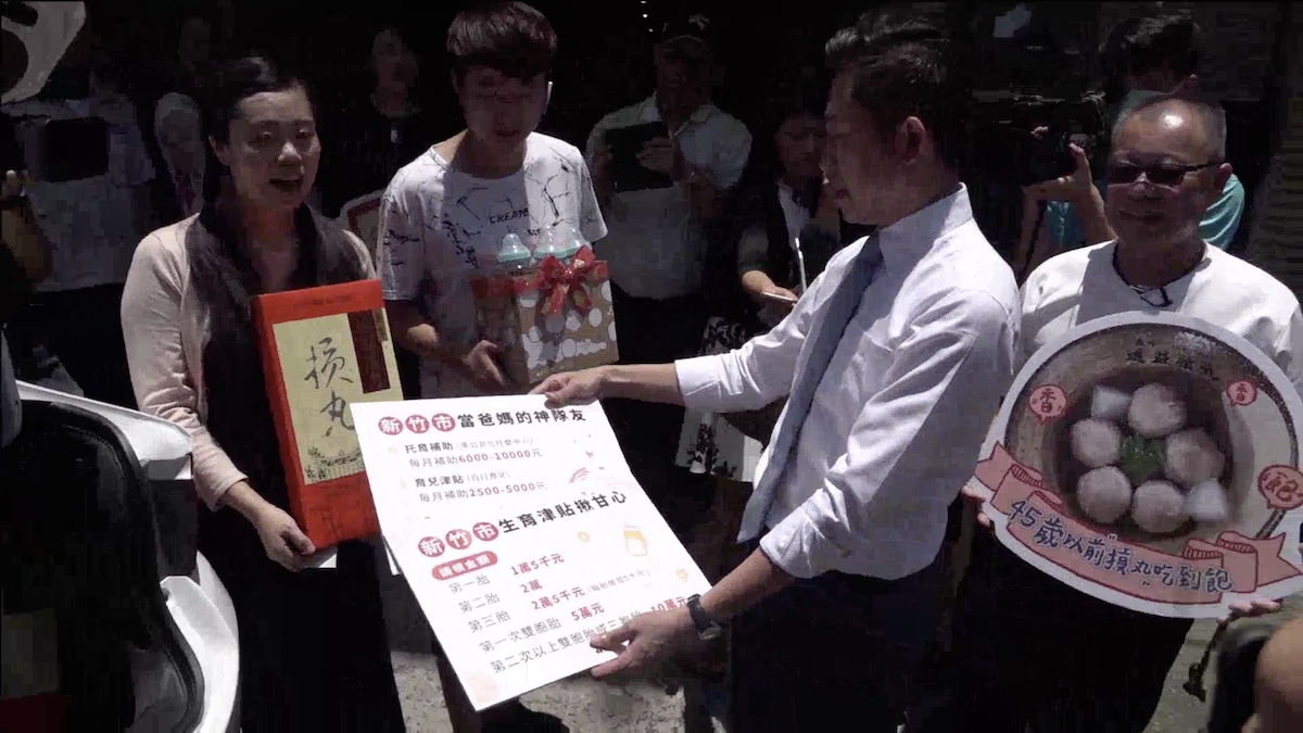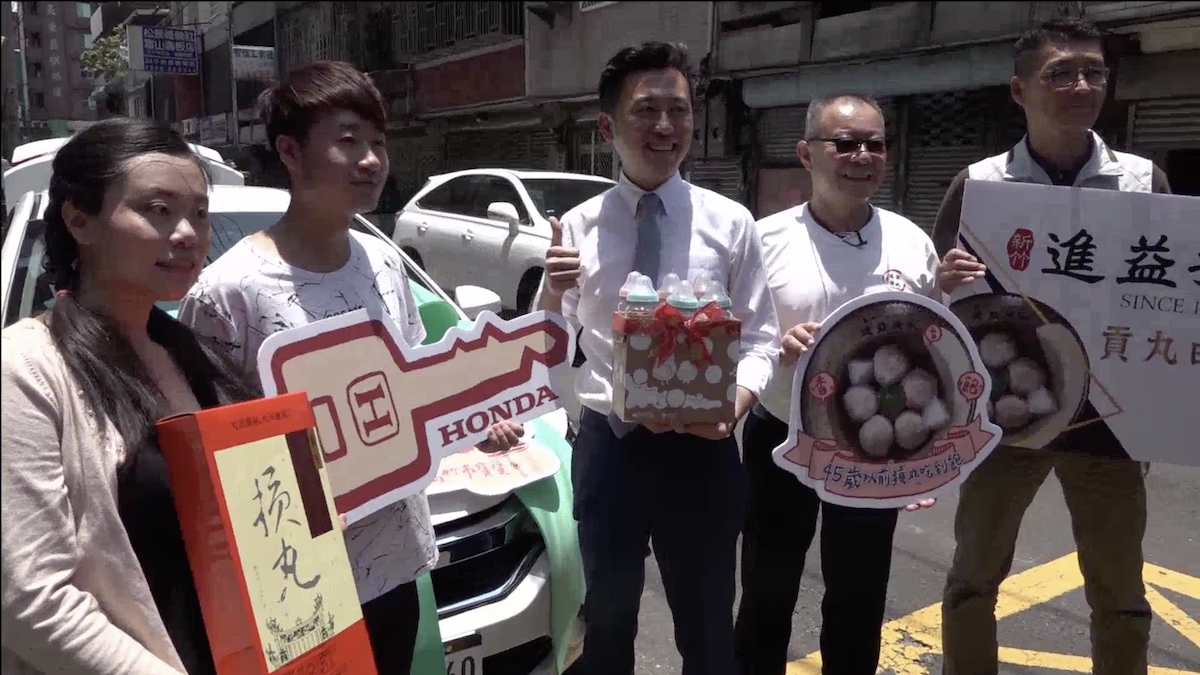 2020年07月02日新竹市為了迎接第45萬名市民的新誕生,新竹市長林智堅親自駕駛一輛「幸福號」,從市府驅車前往第45萬名市民幸運寶寶「冰冰」的家,親手送上新車和貢丸白金卡,可以免費吃貢丸吃到飽直到45歲!