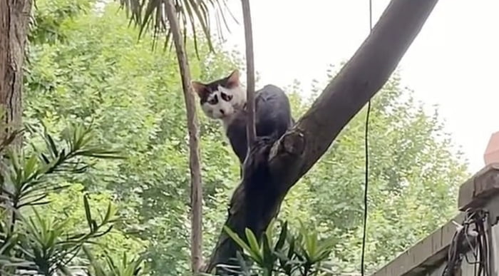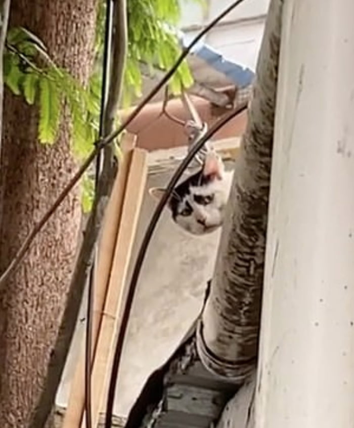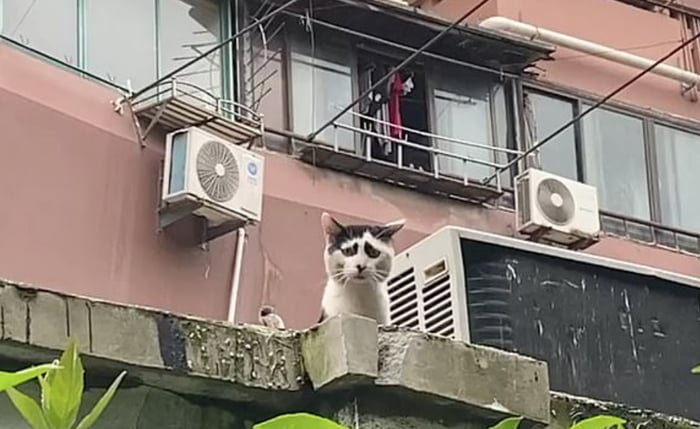 ▼這隻貓咪眼睛的部分有兩簇黑色的毛毛,看起來雙眉緊蹙,渾身都洋溢著衰衰的氣質。牠呆呆坐在牆頭,探出頭看鏡頭的模樣超有趣。