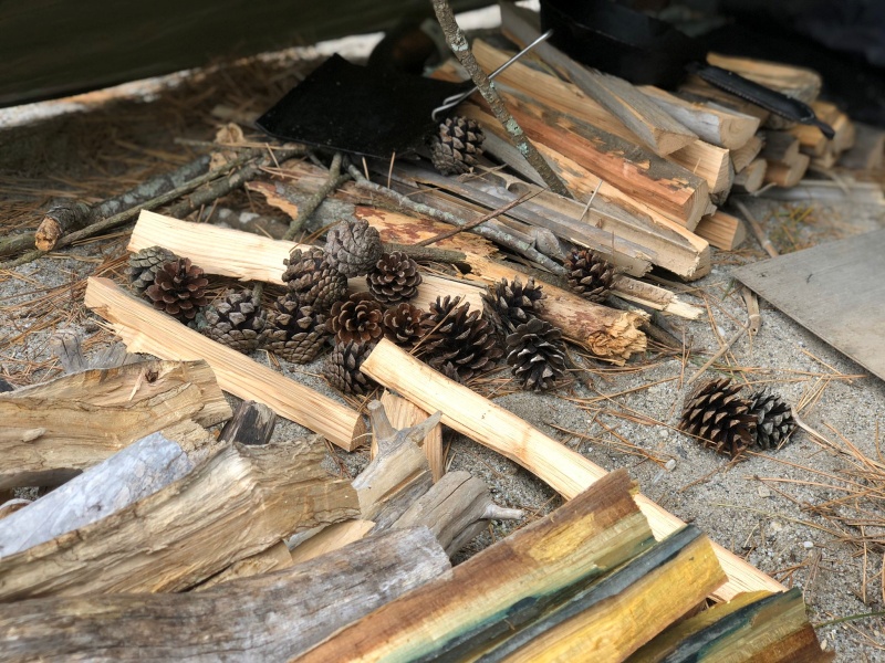 ▼隔天早上推主醒來,堆放生火木材的地方竟然多出了一小堆毬果,原本以為應該是貓咪們為了感謝自己的招待而特地送來的禮物,但到了第二天晚上,卻發現貓咪們看到營火火勢變弱的時候,默默地將毬果推了過去…