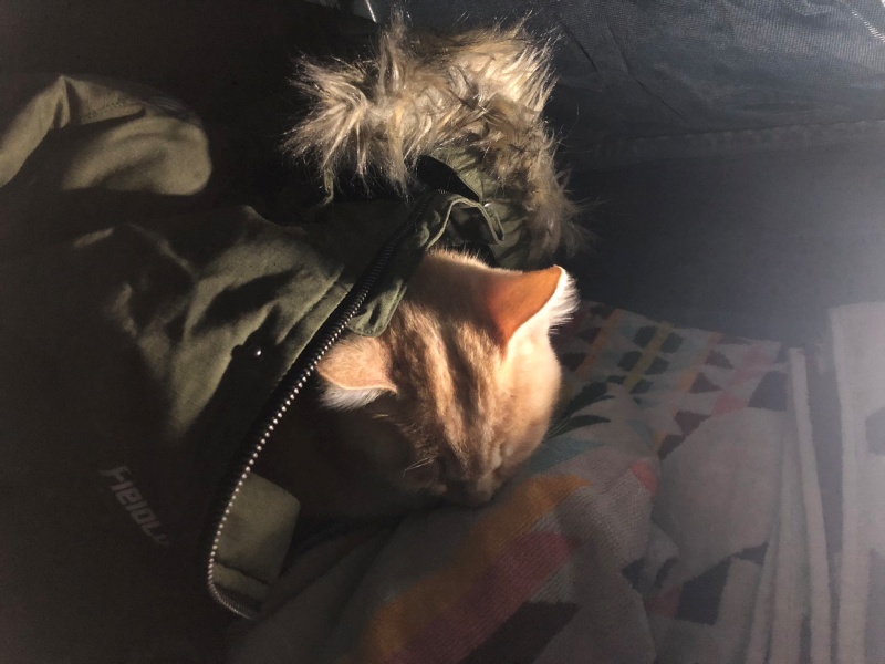 ▼其中一隻橘貓還非常自來熟地走進推主的帳篷,鑽入推主的外套後就舒服地睡了起來…