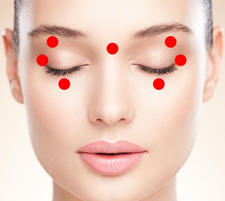 ▼5.眼部按摩:用指尖或指關節按摩兩眼之間的穴位;輕輕按壓眼睛下方的穴位;按摩眼眶,在穴位處微微用力;按壓眼睛上方、眉毛中間位置的穴位;每一個穴位按摩10秒鐘。