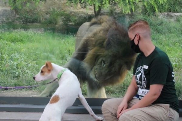 ▼狗狗則去探訪雄獅。狗狗剛開始看到威風的雄獅時有點害怕,但還是好奇地觀察。