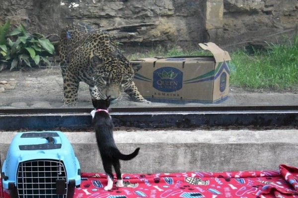 2020年07月10日貓咪、狗狗也會逛動物園!最近美國「聖安東尼奧動物園」(San Antonio Zoo)跟收容所合作,讓一對貓咪與兩隻狗狗來逛園區,欣賞多種多樣的動物。第一次看到大型動物的貓咪、狗狗興奮又好奇。特別是小貓跟豹同框時,小貓跟大貓四目相對,看起來格外有趣。