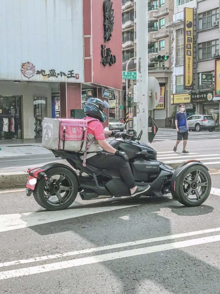 ▼一名網友在《爆笑公社》貼出一張停紅燈時拍下的照片,照片中只見一個年輕人穿著外送平台Foodpanda的制服,機車後座載著食物保溫箱,一副標準外送員的配備;但仔細一看,這名騎士座下騎的可不是一般的機車,而是超霸氣的百萬三輪重機「Ryker 900」…