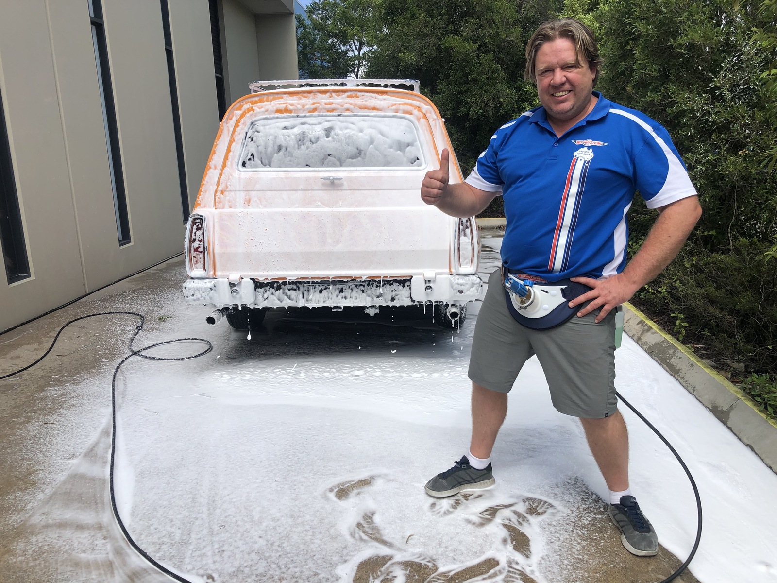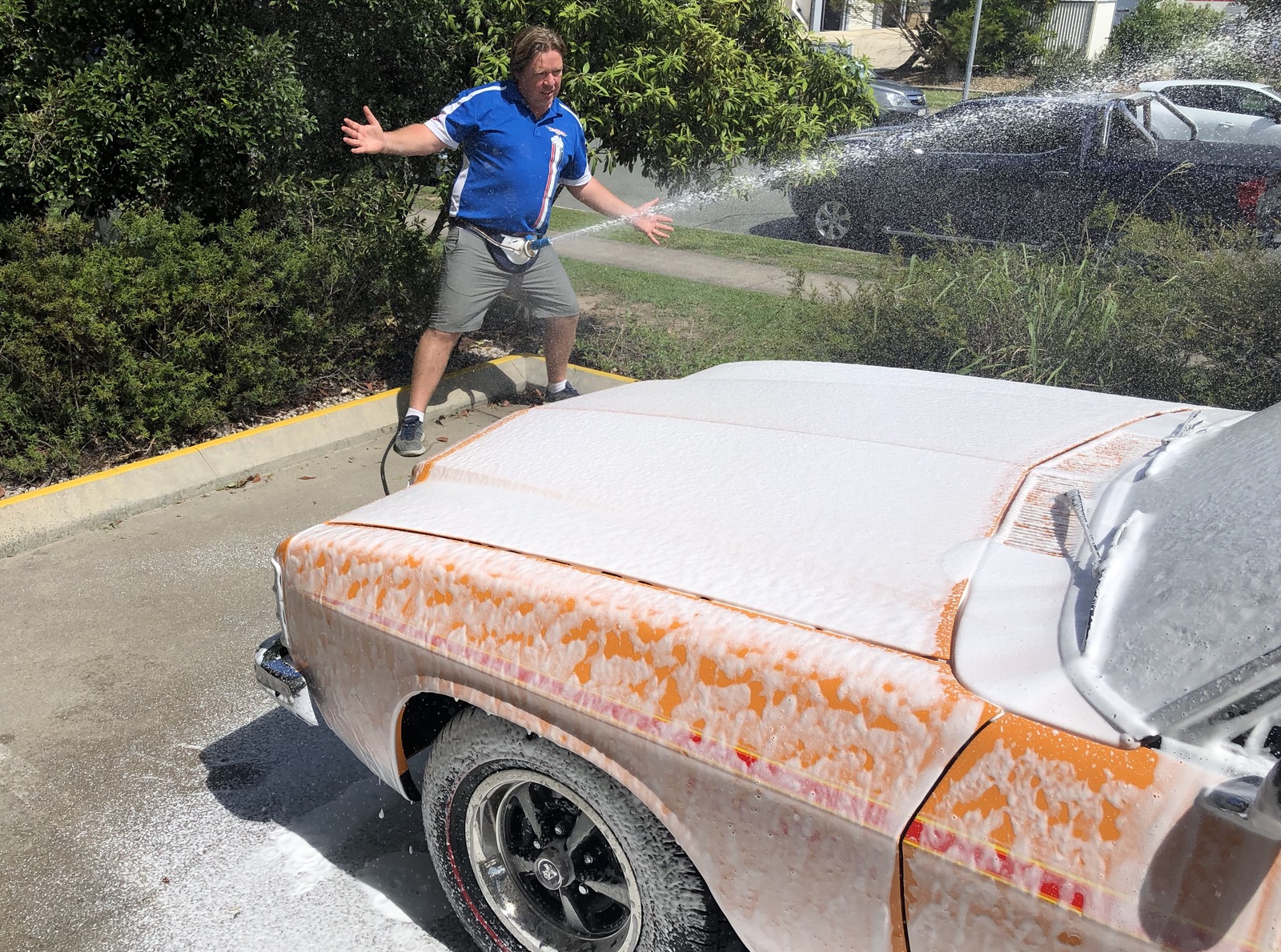 ▼這款名為「THE CROTCH CANNON」的裝置能穿戴在腰部,前面是噴射水龍頭,清潔劑安置在腰後,造型非常吸睛。由於這樣的設計,讓洗車時不會覺得疲憊,反而非常好玩。