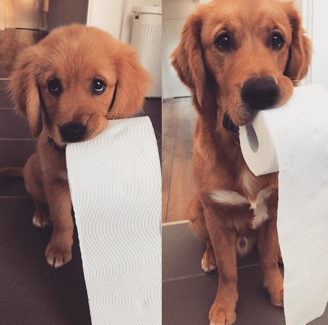 ▼3個月 vs 7個月的狗狗,還是很愛玩衛生紙。