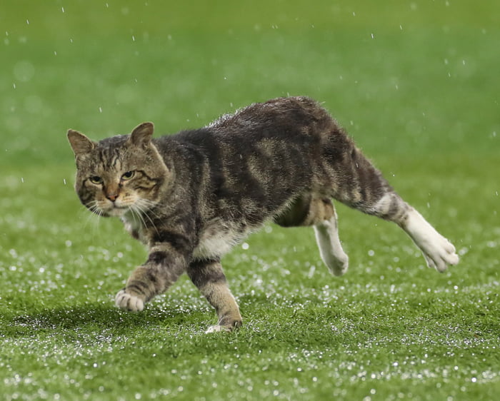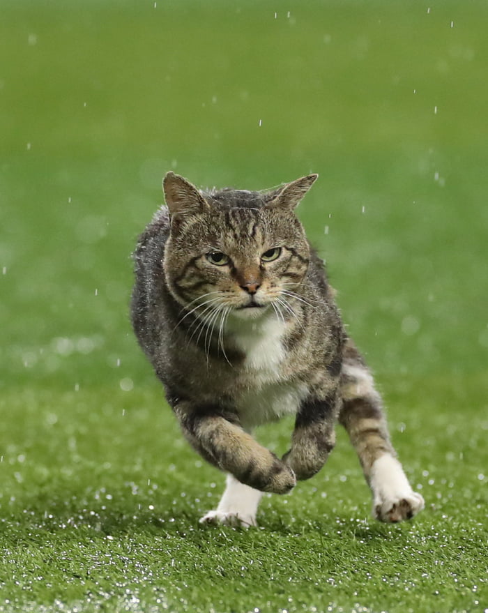 ▼這隻虎斑貓不知道怎麼來到球場中,因為球場邊緣的區域有高高的軟墊,牠一時之間找不到出口,只能在球場上狂奔。當時球賽剛剛結束,一位體育攝影師發現貓咪後拍下了牠帥氣奔跑的英姿。
