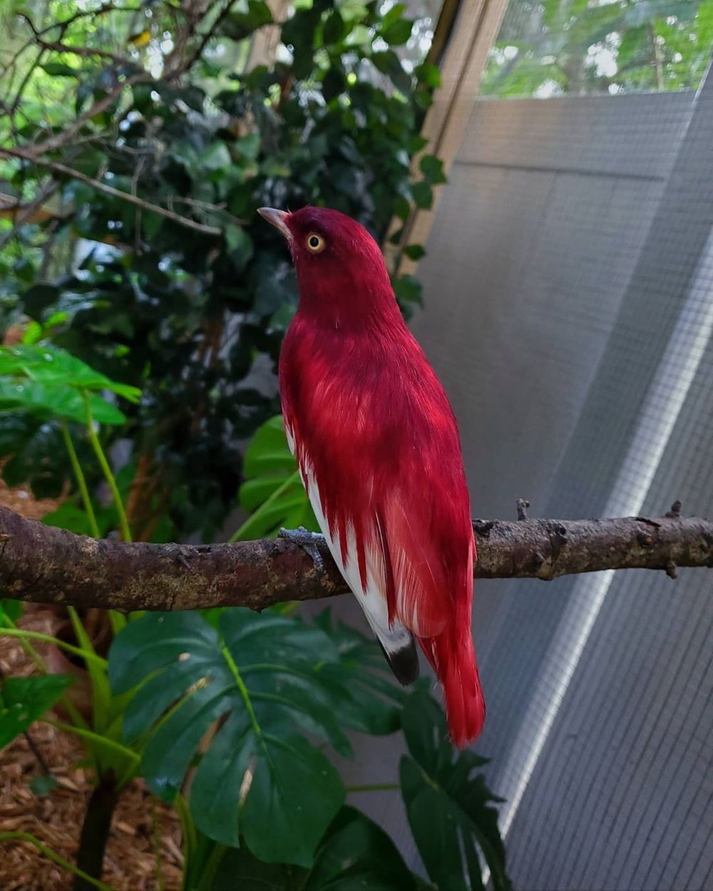 ▼人們一直對白翅紫傘鳥的羽毛顏色很感興趣,那種高級的酒紅色自然又神秘。這種鮮豔的顏色其實是來自胡蘿蔔素。
